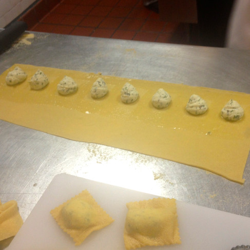 After the gnocchi, we moved on to ravioli. Like I’ve mentioned before, by the end of class I sometimes have no choice but to turn my autopilot on. With that being said, I am sure you aren’t surprised to hear that when My-Tree and I brought our ravioli dish up to chef he said laughing “Looks like Chef Boyardee made this”. HAHAHHAHAH- talk about amateur hour. We used the classic tomato sauce with all the pureed vegetables (not my fav), but making the ravioli’s were fun. We finally got to use the ricotta cheese with chopped up herbs as the filling. Once we shaped our ravioli, we followed the same procedure for cooking gnocchi, but this time instead in butter, we used the tomato sauce. I ate the ravioli like a picky four year old, only scooping out the ricotta cheese. By the end, my plate looked like a dinosaur took it’s claws and went to town on it’s prey.